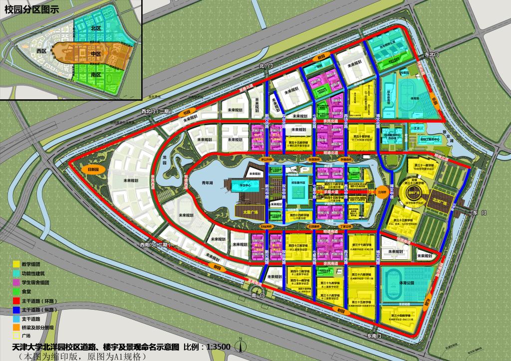 天津大學北洋園校區(qū)總建筑面積130萬平方米,按照“統(tǒng)一規(guī)劃、分期建設、分步實施”的原則建設。一期建設面積90萬余平方米,包括主樓、行政樓、綜合實驗樓、圖書館、體育館、教職工活動中心、學生活動中心及各學科組團等22個組團, 2015年基本建成。